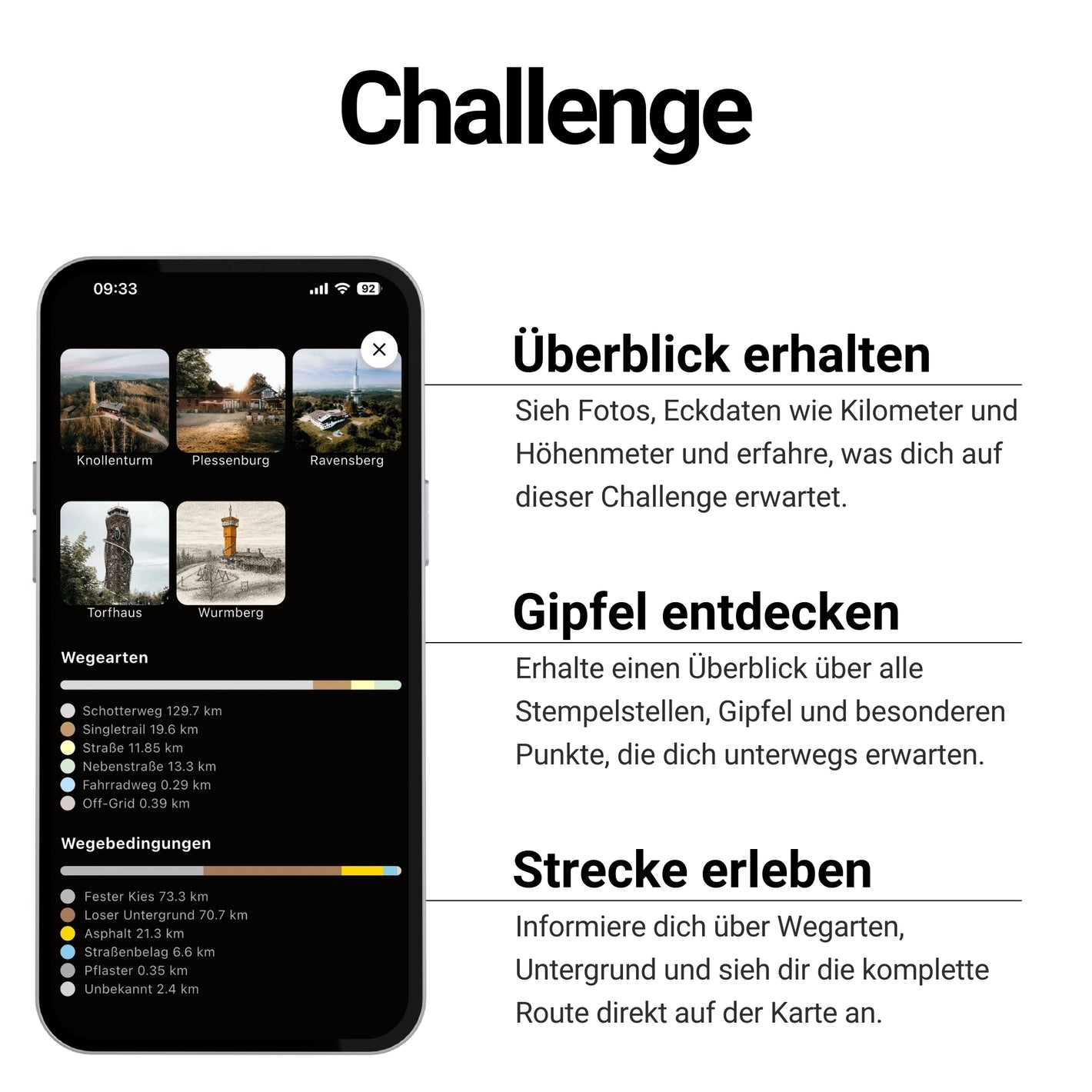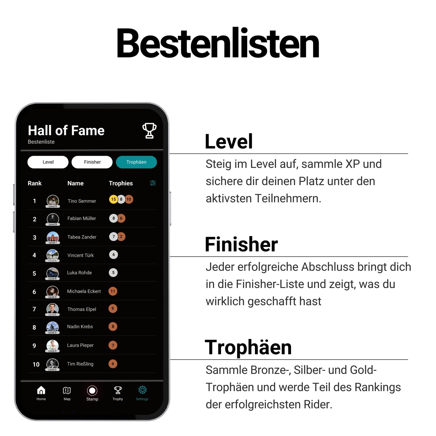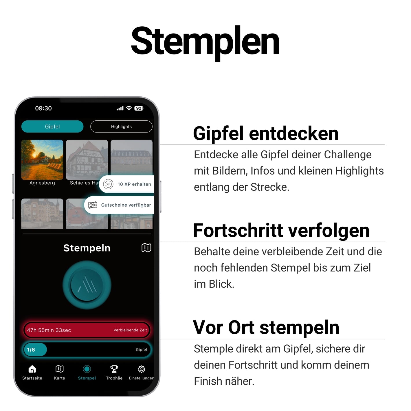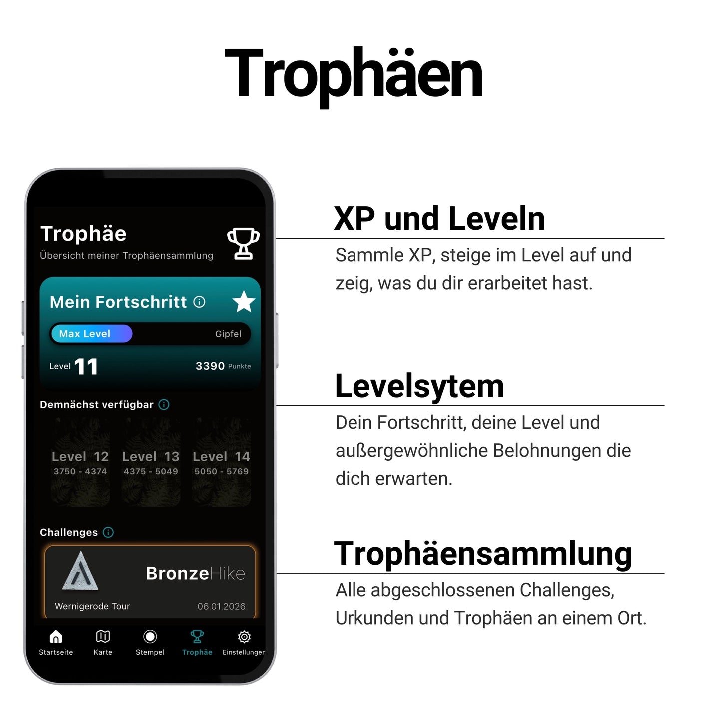 Dein Schlüssel zum perfekten Abenteuer! Aktiviere deine Challenge, erkunde atemberaubende Touren und sammle Stempel an den spektakulärsten Spots! Steige durch gesammelte Punkte im Level auf und sichere dir später exklusive Belohnungen. In deiner digitalen Trophäensammlung behältst du jederzeit den Überblick über deine abgeschlossenen Touren und gesammelten Stempel.