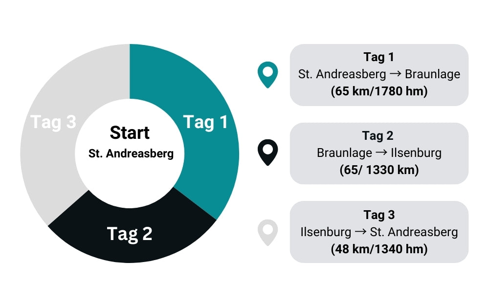 Egal, ob du dich für Gold, Silber oder Bronze entschieden hast, wir haben die Strecke für dich bereits optimal aufgeteilt. Je nach Startort bekommst du die passende Einteilung: eine Etappe (Gold), zwei Etappen (Silber) oder drei Etappen (Bronze). Mit allen Infos zu Kilometern, Höhenmetern und passenden Partnerhotels. Kein Aufwand, einfach Startort wählen und losfahren!
